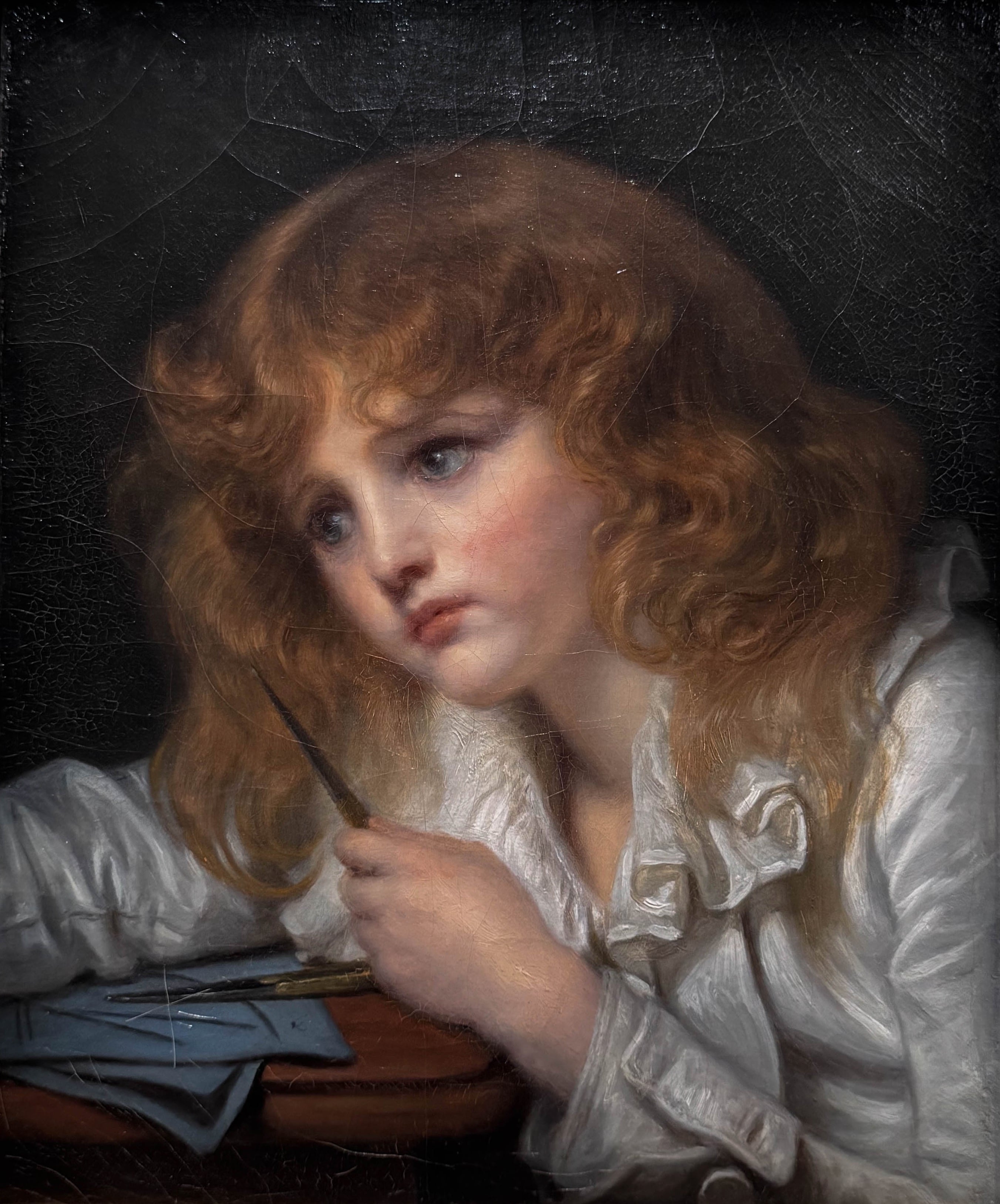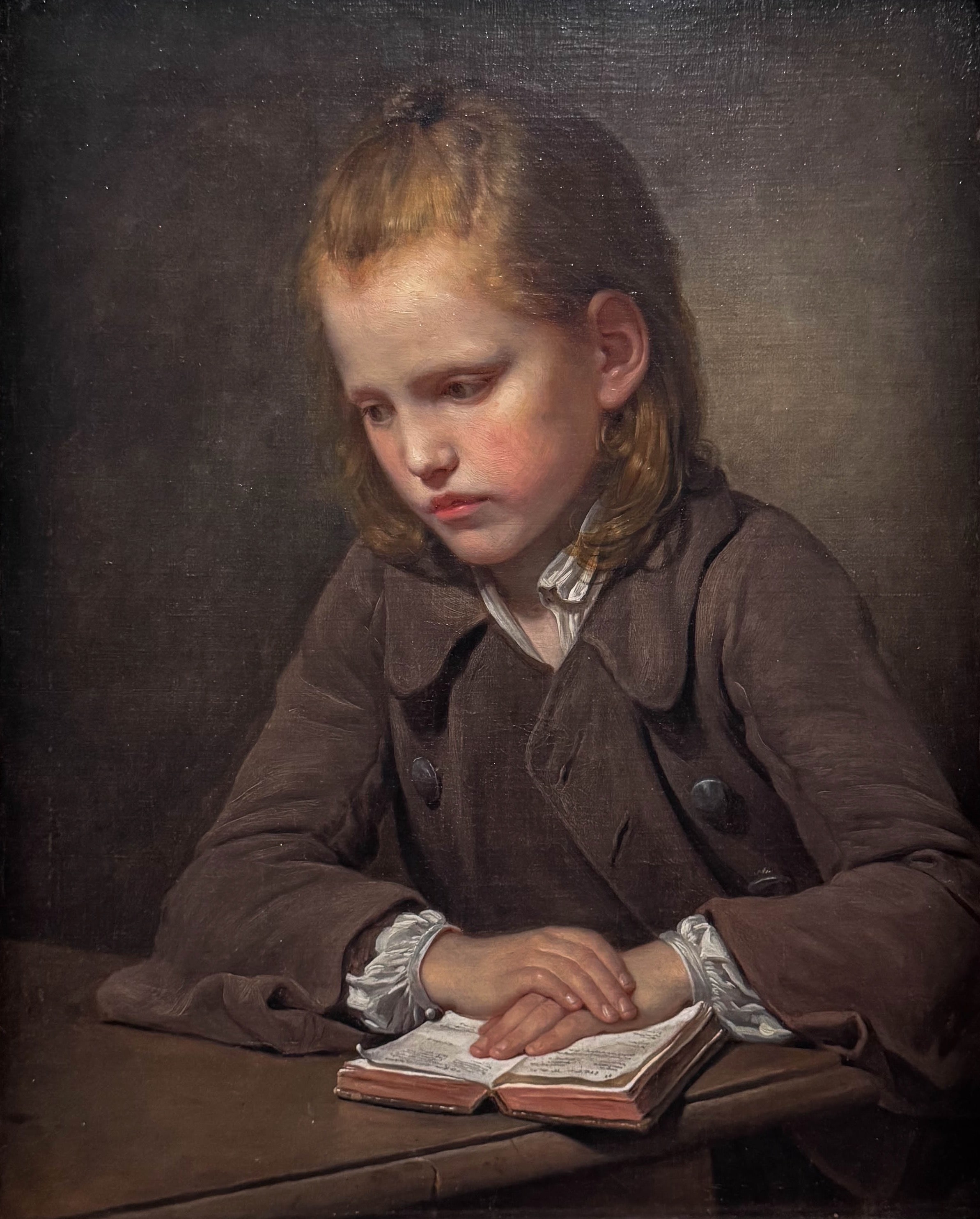 Évoquons également, une œuvre plus « ancienne », Le Petit Écolier (1755-1757). La palette chaude, la douceur du modèle rend l’idée d’une vérité émotionnelle, à l’inverse de la pose de l’œuvre précédente. L’écolier semble appliqué et calme reflétant l’idée des Lumières de la valeur morale primordiale du travail, et l’autonomie déjà existante d’un âge autrefois négligé. Inspirée du travail de Chardin, l’œuvre sera exposée au Salon de 1757.