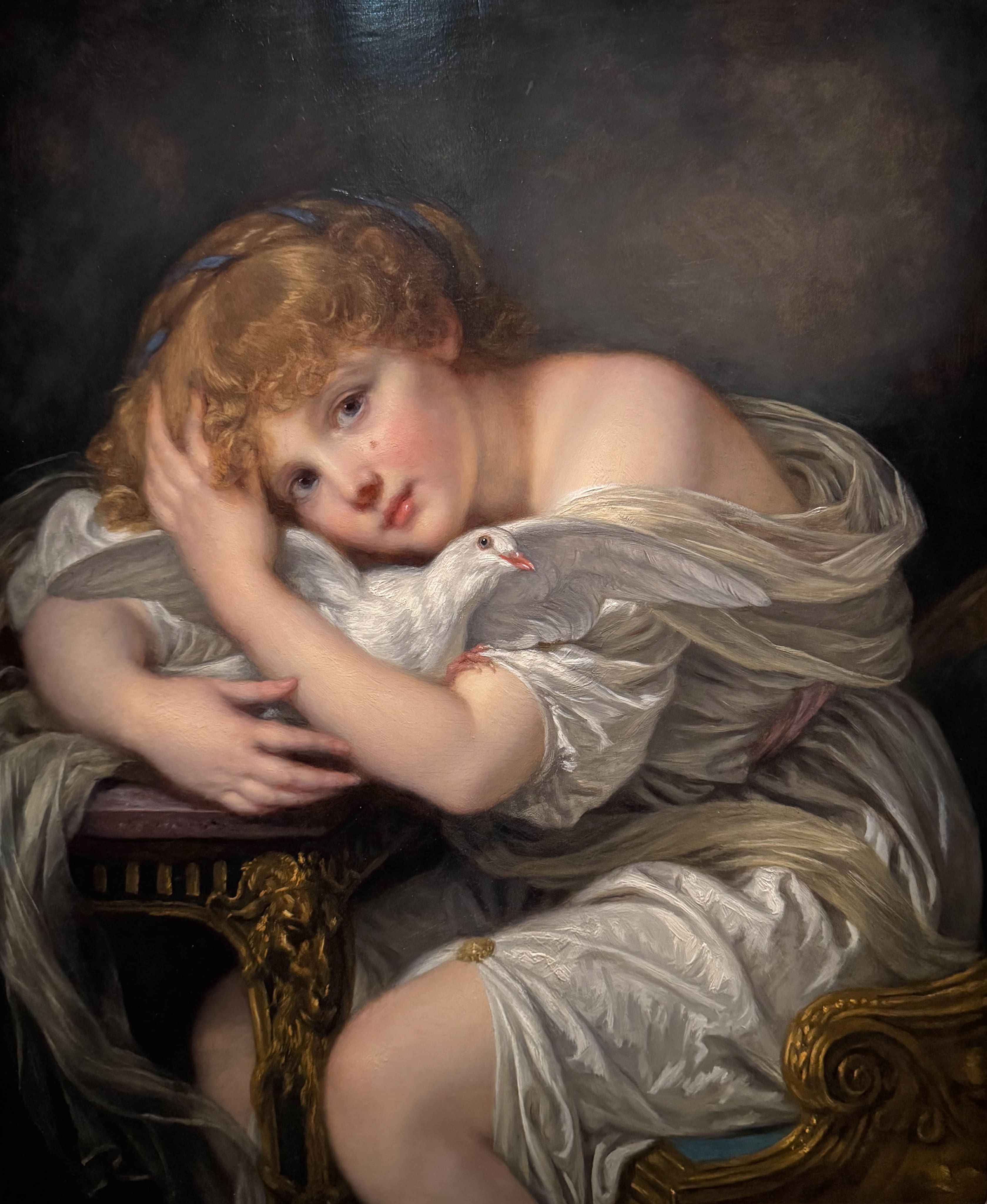L’enfant comme tous les âge à un fin qui s’annonce comme une perte, celle de l’innocence. Au travers de l’aboutissement vers l’âge adulte, Greuze interroge sur le sort réservé aux jeunes adultes dans la société contemporaine. Vêtue de blanc, la Jeune Fille à la colombe (1780) évoque l’innocence et la pureté, un modèle de jeune femme sensible, un idéal féminin. Le symbolisme est donc important dans une œuvre qui nous laisse apercevoir une colombe aux traits naturels et détaillés.