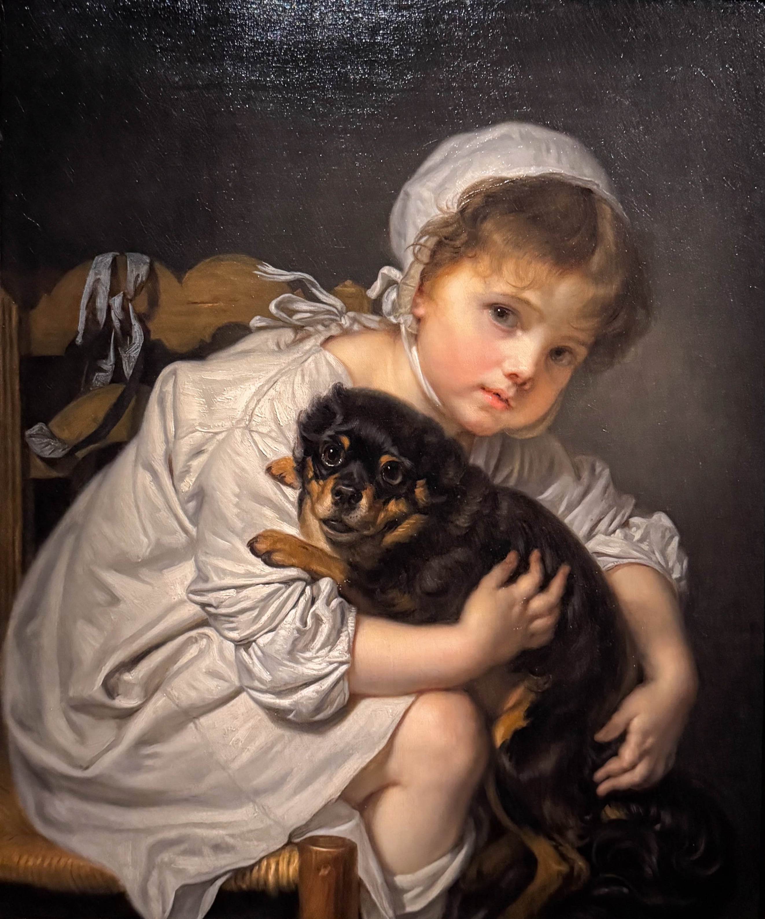Greuze ne cesse de s’inspirer de sa vie et de sa famille dans ses œuvres. De fait, il est naturel de retrouver des portraits familiaux dans son œuvre. En 1767, il réalise Portrait de Louise-Gabrielle Greuze, sa fille. Ce portrait est remarquable par sa réalisation mais également par le rendu du corps de l’enfant sur la chaise, en chemise et bonnet de nuit et, plus encore, par le regard du chien qui protège l’innocence de la jeune enfant.