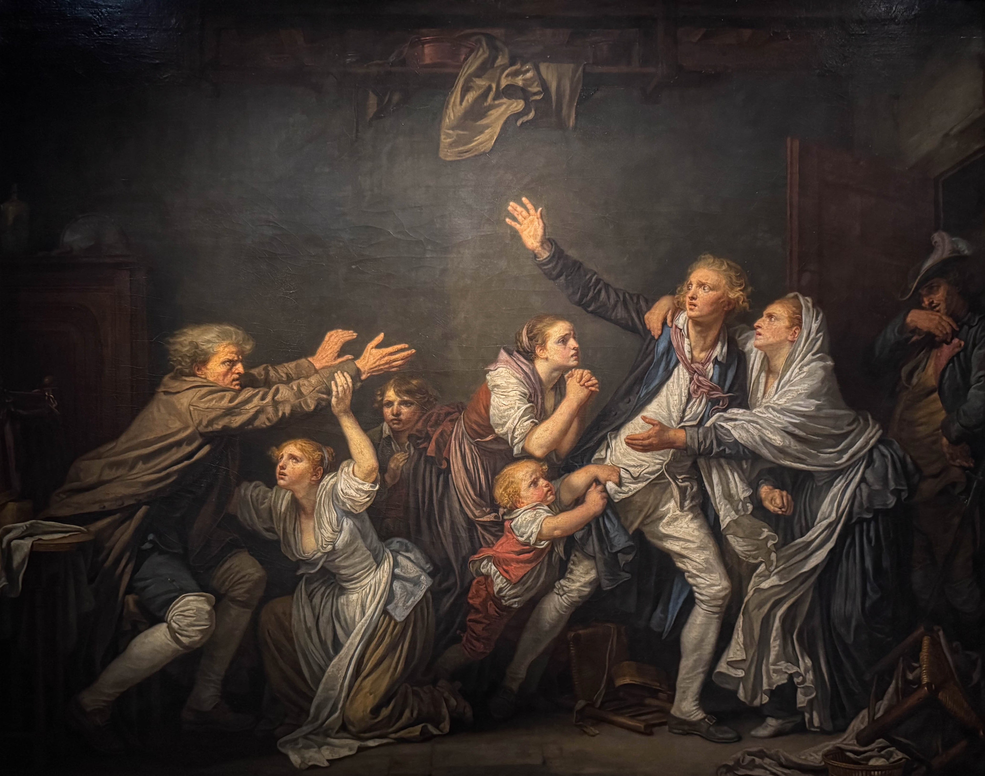 Quelques années plus tard, Greuze représente l’inverse : Le Fils ingrat (1777), maudit par son père et entouré d’une famille qui fait face à la mort de la figure d’autorité.