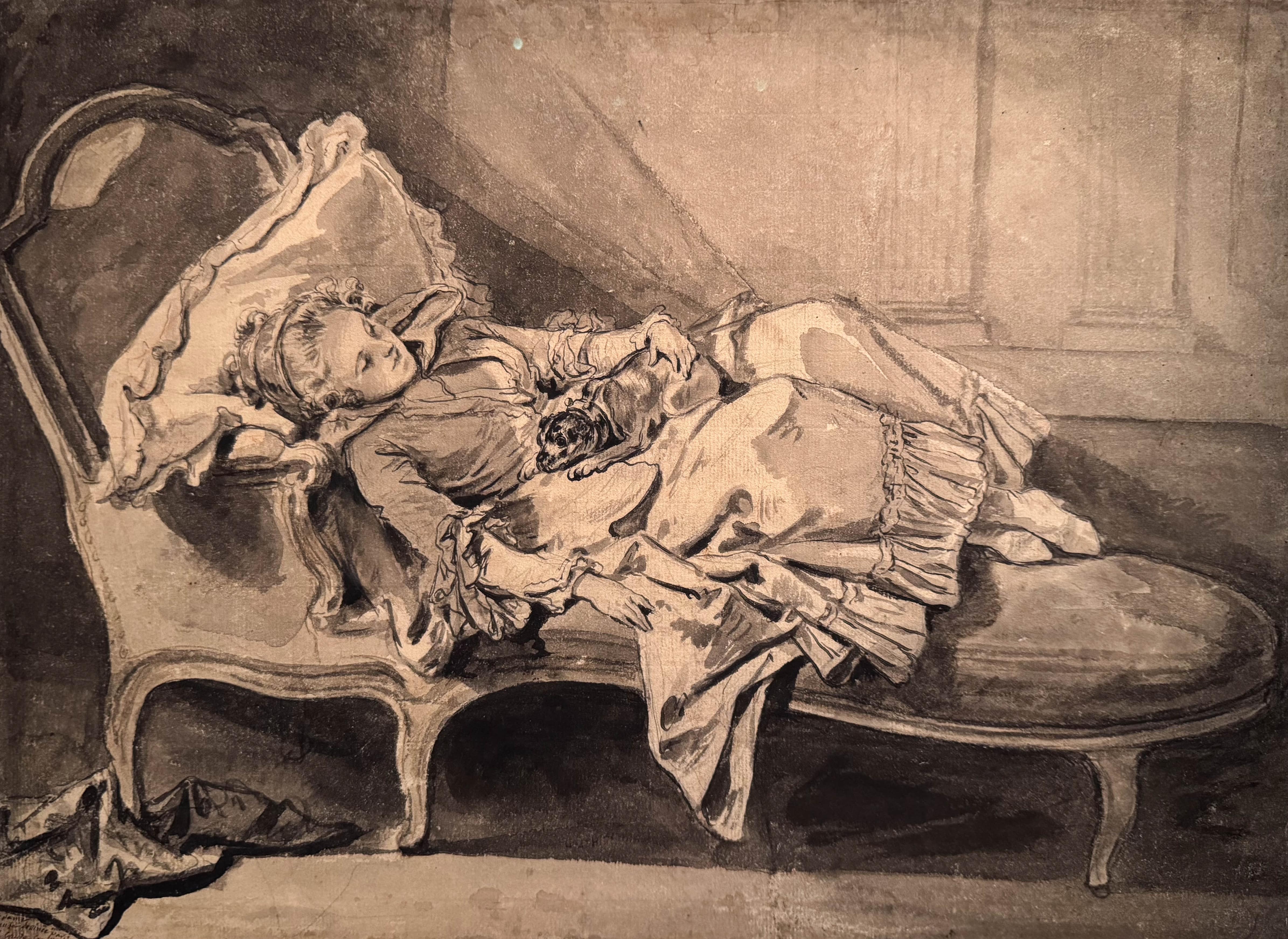 Il représente également la beauté de celle qu’il épouse le 3 février 1759, Anne-Gabrielle Babuty, fille d’un libraire. Elle sera représentée relativement souvent dans son œuvre marquant le charme qui s’opère sur son heureux mari. En 1759, Jean-Baptiste la représente dans une scène intime, endormie pendant la sieste. L’on remarque la présence du protecteur canin présent dans l’œuvre précédente.