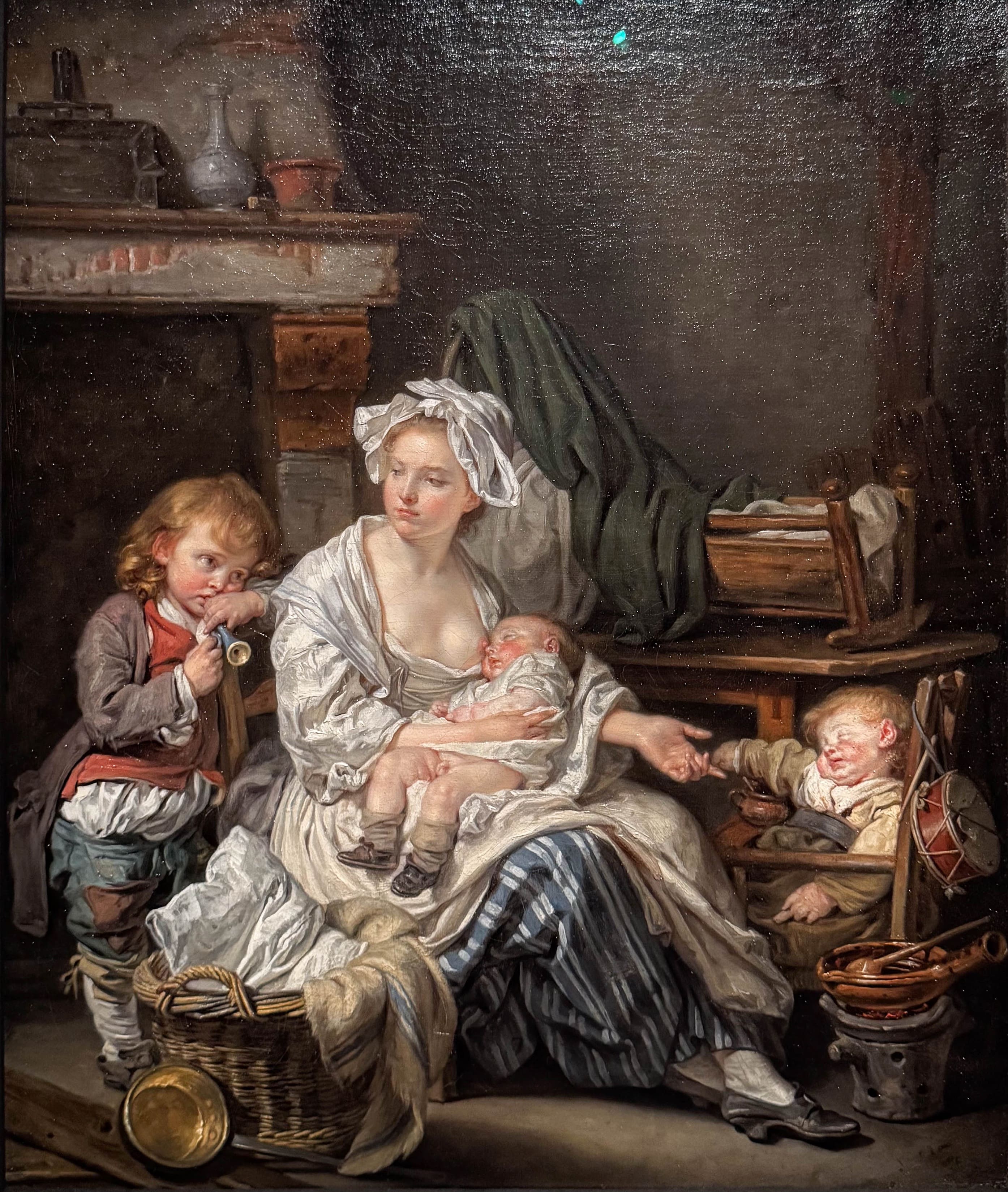 L’époque est à la reflexion sur la place de l’enfant et l’on ne peut interroger cette place sans s’interroger sur le rôle de la mère et l’éducation qu’elle prodigue à sa descendance. Le Repos ou Silence ! (1759) donne matière à reflexion avec cette mère de trois enfants allaitante. Le regard de la mère semble inviter l’enfant la trompette de cesser et de part ce regard imposer son autorité, elle renforce son avertissement en pointant du doigt le tambour qu’il a son doute déchiré. La mère est représentée sous forme de triangle qui se détache de l’œuvre comme pour idéaliser la maternité et pour faire admettre la famille comme un lieu d’émotions et de sensibilité.