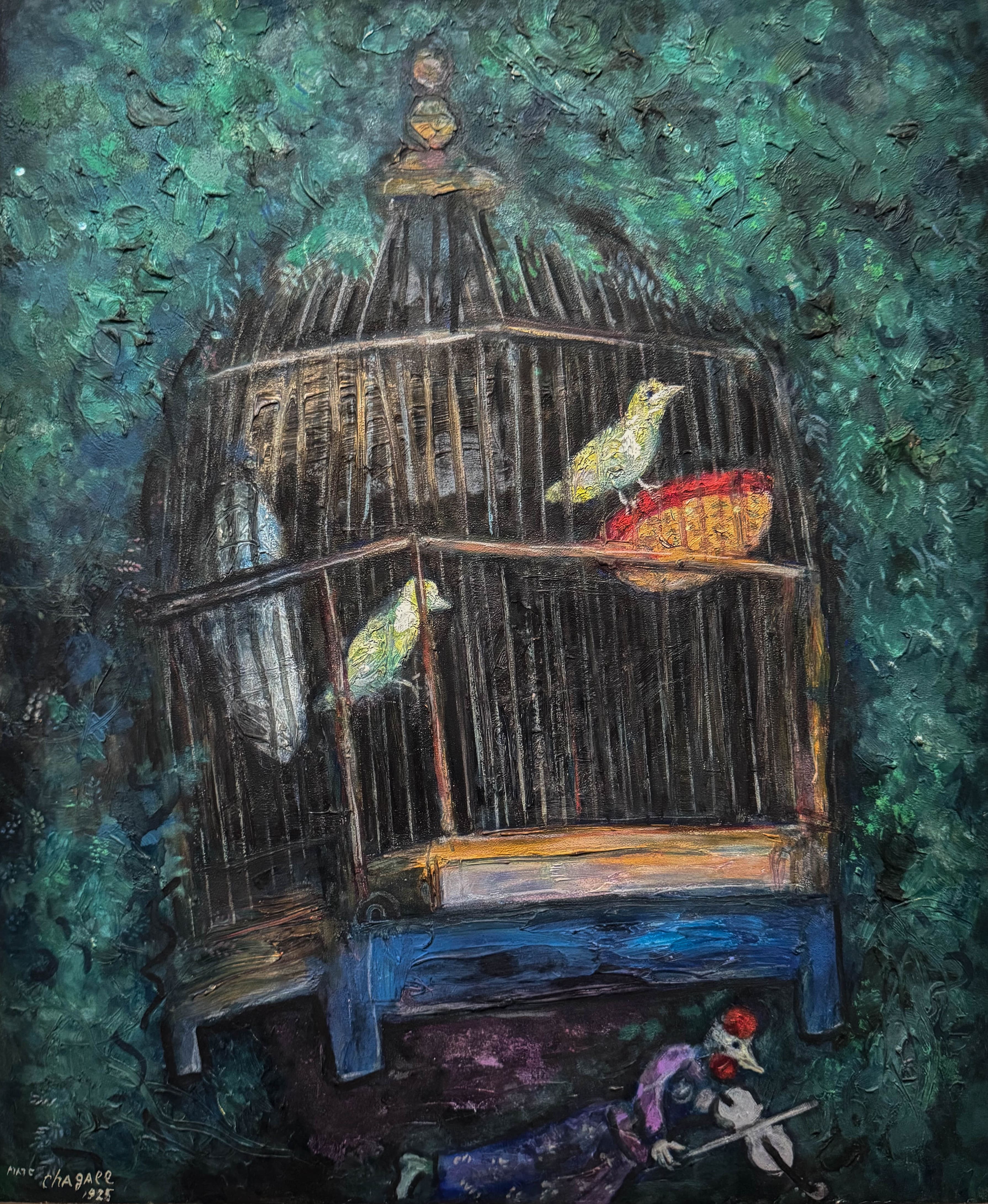 Autre artiste important de XXème siècle, Marc Chagall présente son œuvre La Cage d’oiseaux (1925) au moment de l’exposition « Les Oiseaux », organisée par la Galerie B. Weill en 1929. L’œuvre est symbolique, dans un univers de poésie, de couleurs intenses. La dominante de bleu est une évocation de la nuit, du rêve ou d’une spiritualité et sera souvent présent dans les œuvres de l’artiste. Les proportions ne sont pas respectées et les contours parfois abstraits.