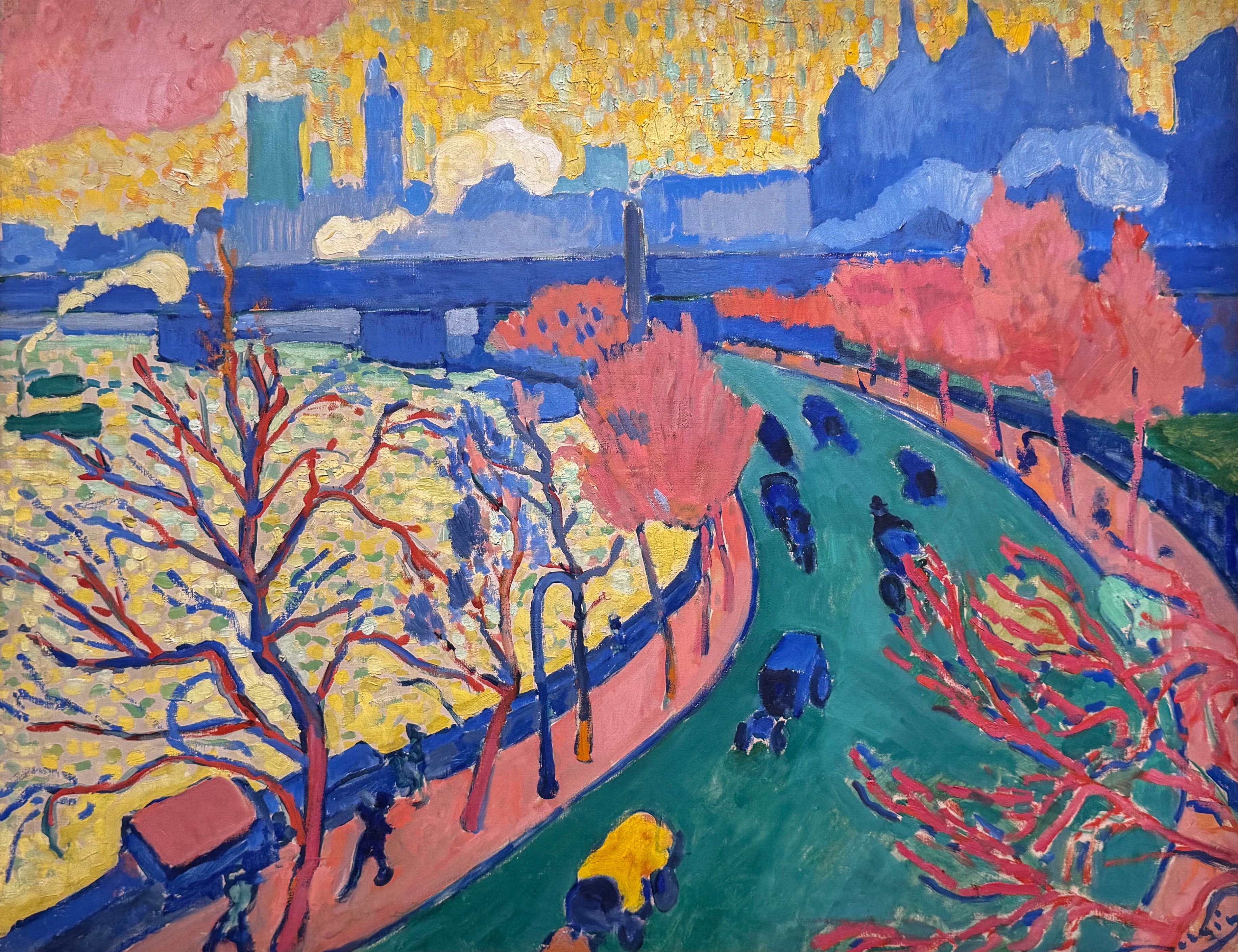 André Derain fait partie des artistes exposés par Berthe Weill dès 1905. Elle vendra ses œuvres jusque que dans les années 30. Après avoir exposé à la galerie Weill, il part pour Londres où il va réaliser des vues de la ville, d’un fauvisme assumé. Le Pont de Charing Cross (1906) implique des couleurs qui n’ont pas pour but de coller à réalité mais elles expriment le mouvement, l’émotion et l’énergie du lieu peint. Les lumière naturelle n’y est pas présente, ce sont les couleurs qui prennent ce rôle.