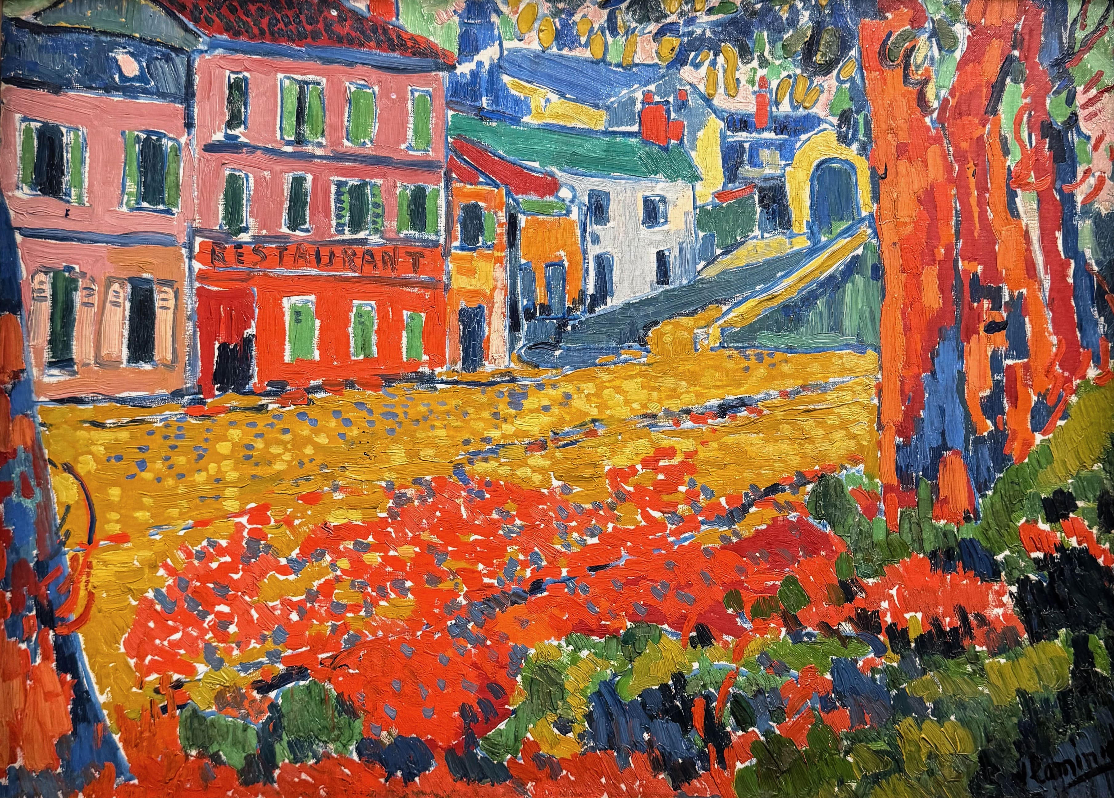 Vlaminck sera l’un des fondateurs du Fauvisme dans Le Restaurant de la Machine à Bougival (1905), l’on peut observer son approche par la couleur vive, criarde, presque violente et porteuse d’émotions. La composition est très simple, la perspective peu soignée, la peinture apposée en empâtements qui peut donner une impression de mouvement. En bref, l’œuvre est un moyen pour le peintre d’exprimer ses émotions intérieures.