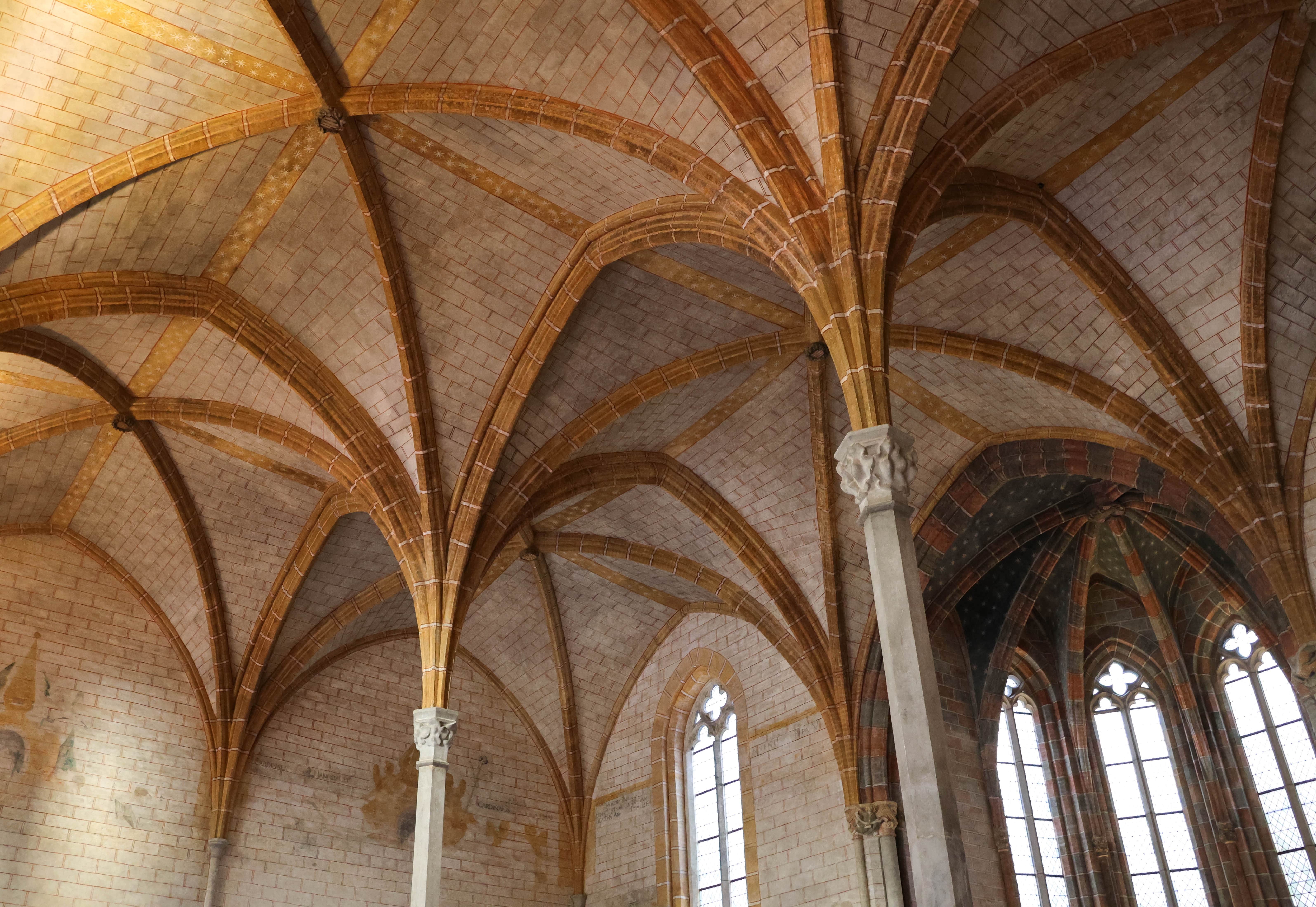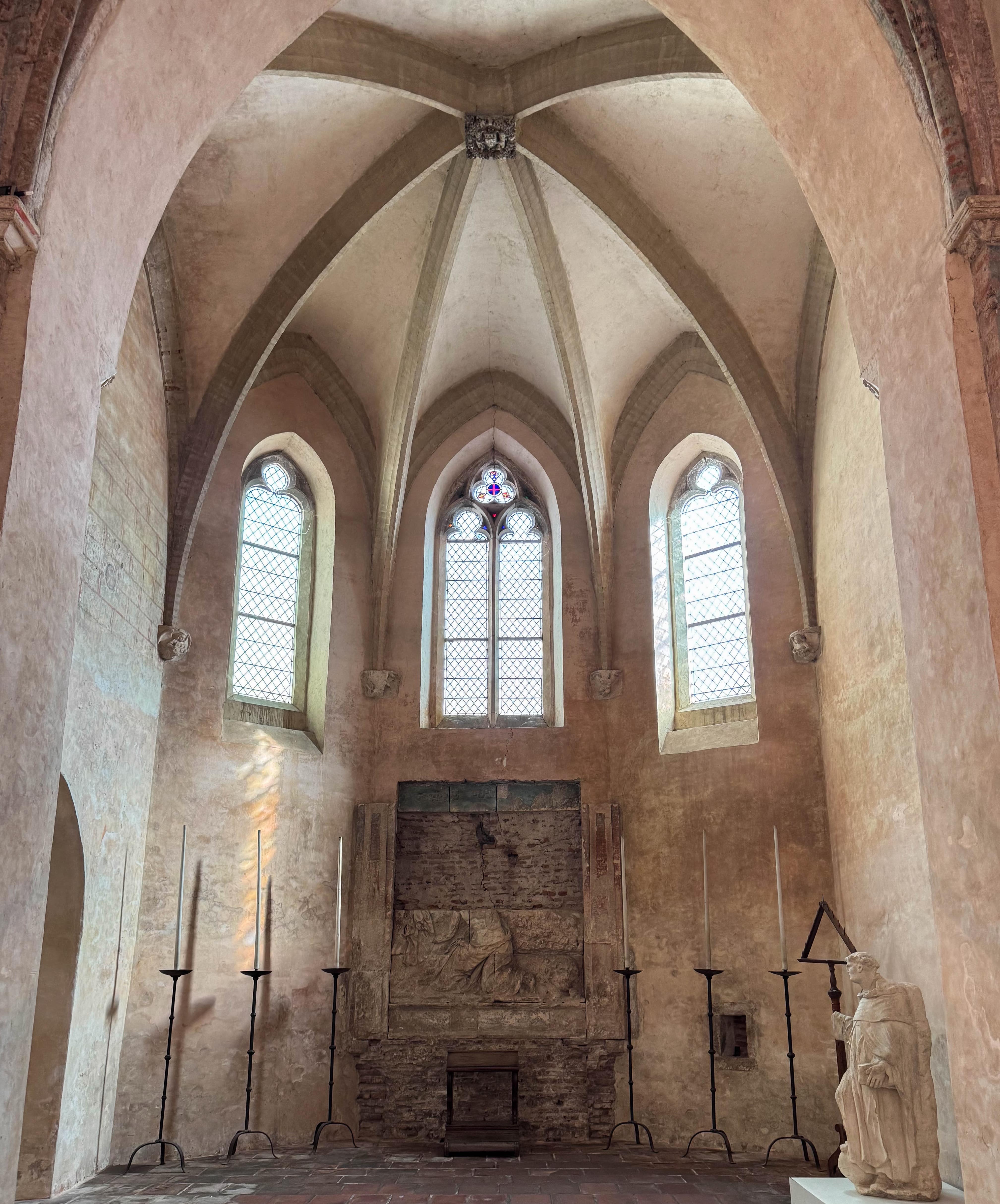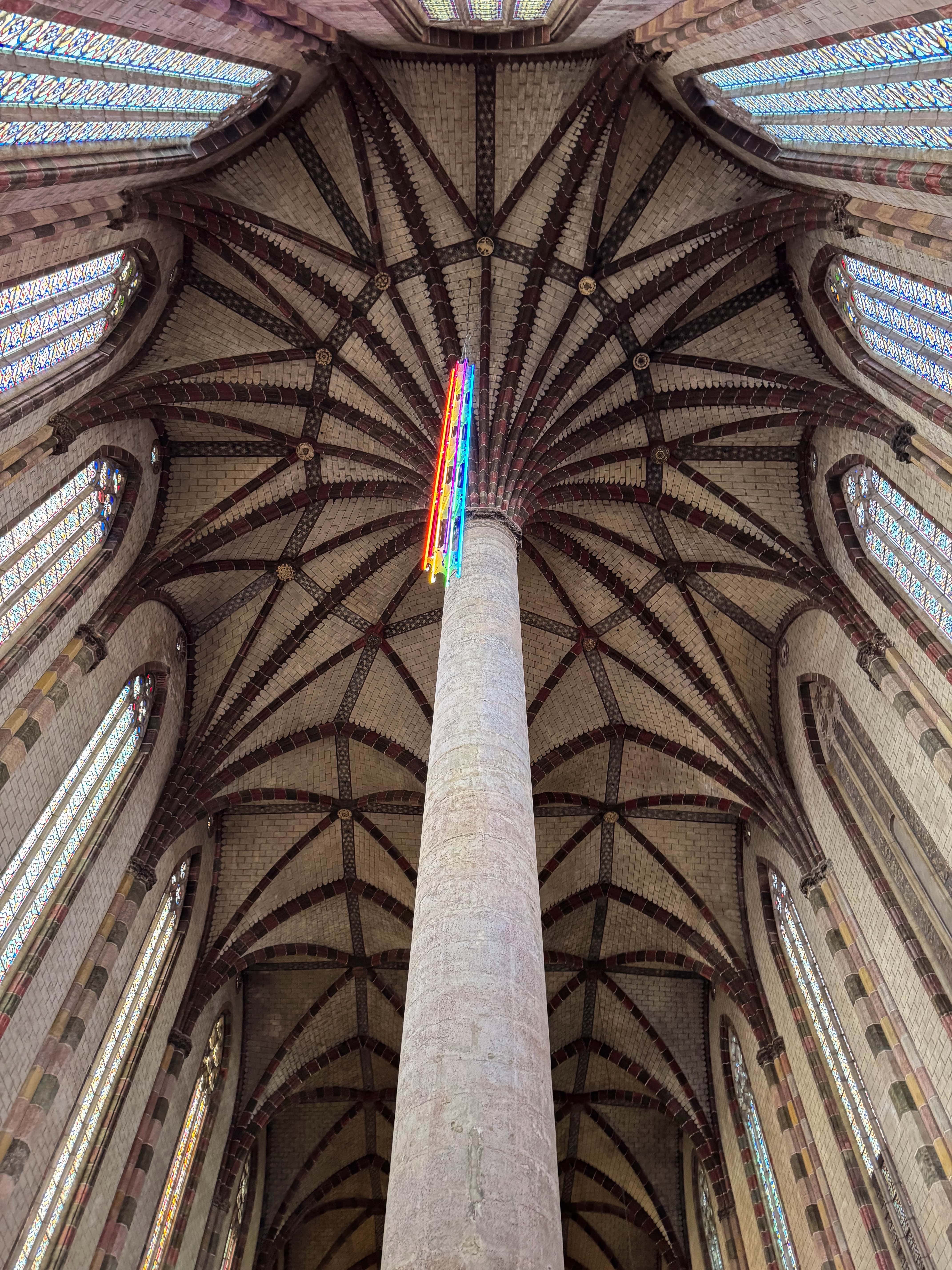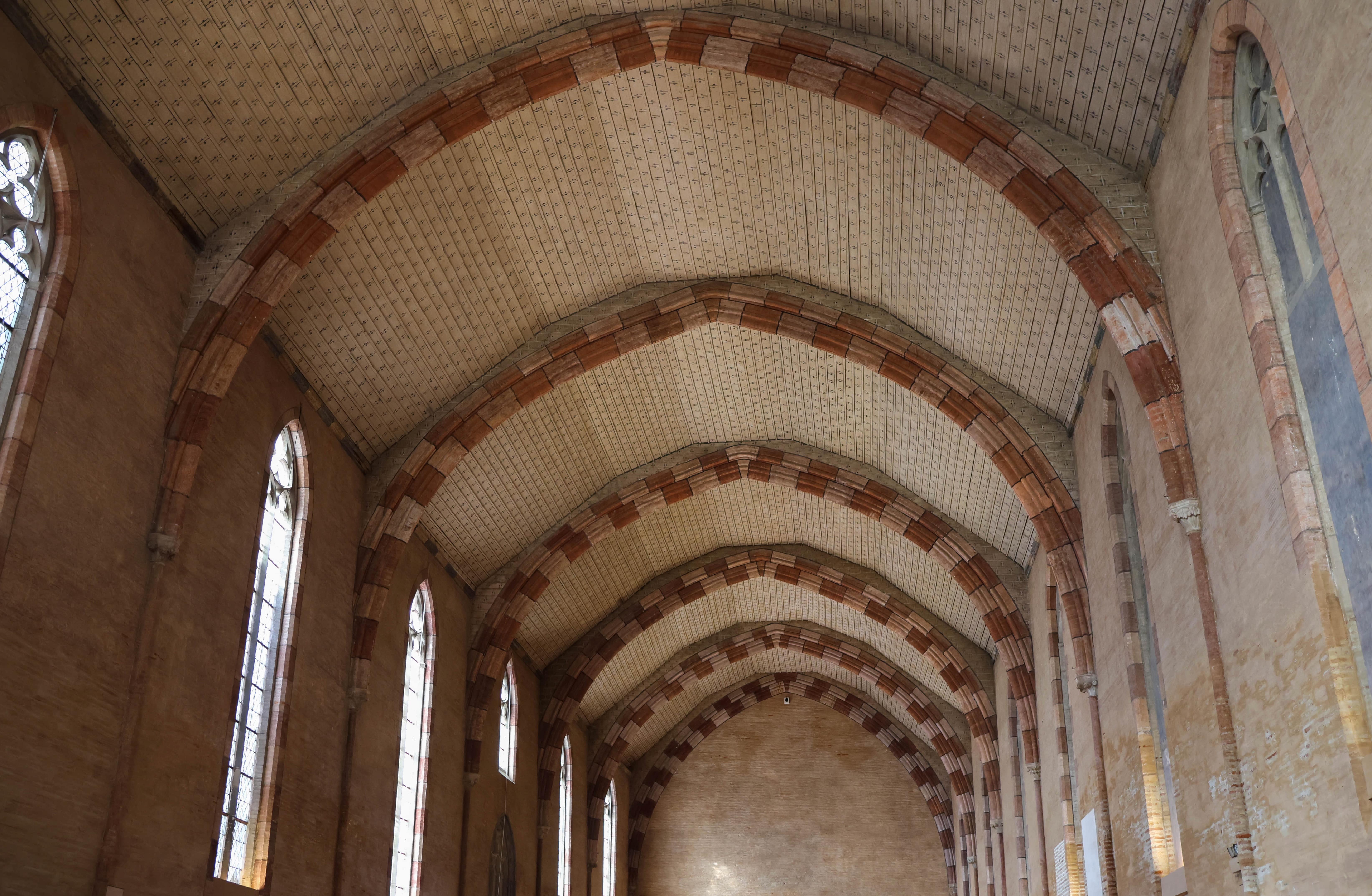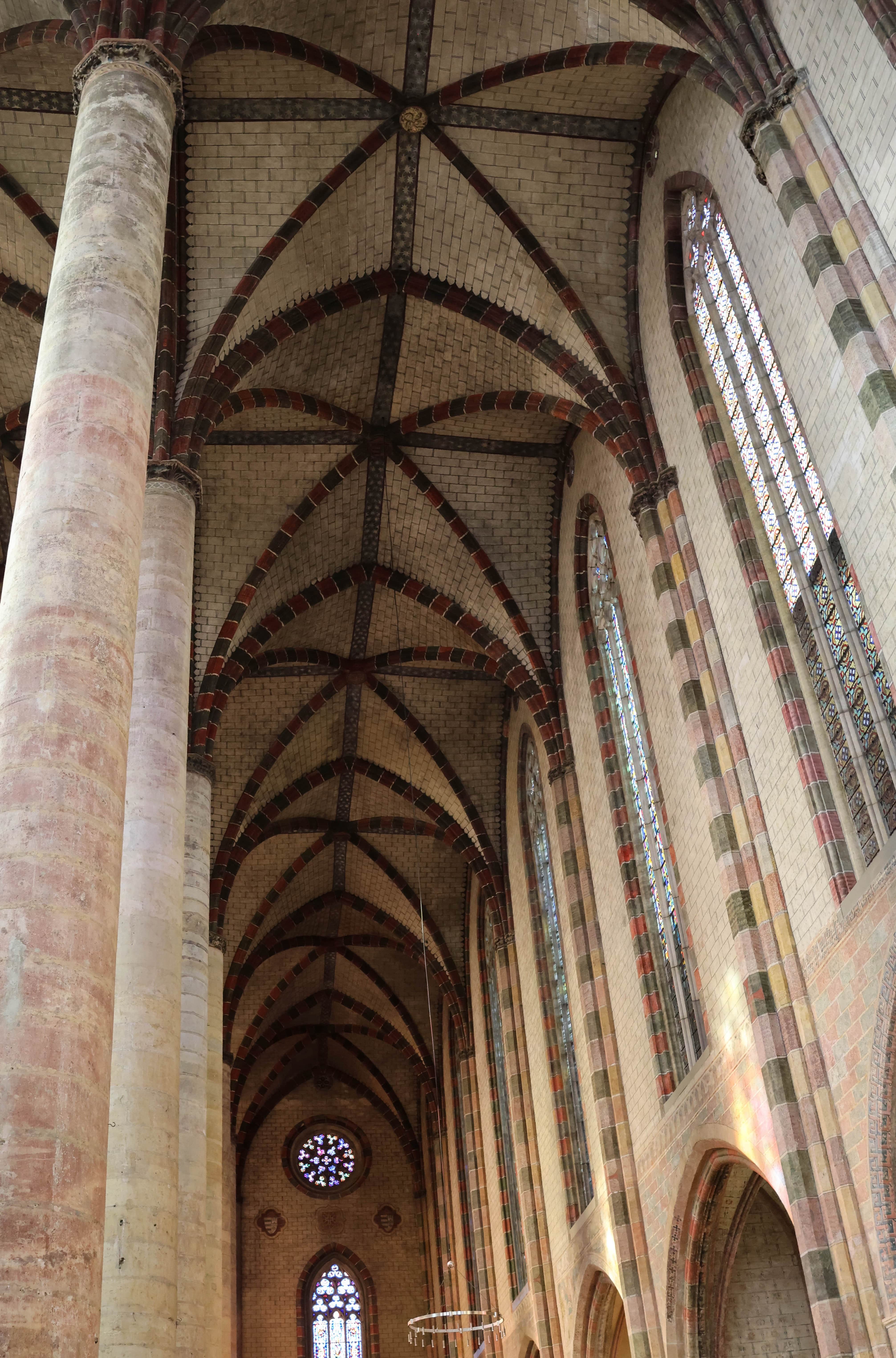 En l’an de grâce 1275, l’abside est totalement transformée. La charpente de bois est remplacée par des croisées d’ogives somptueuses, en briques, soutenues par trois nouveaux piliers massifs. Dans le même temps, la merveille connue et reconnue du couvent fait son entrée : le palmier, à 28 mètres du sol. La colonne orientale supporte un ensemble de voûtes et d’appareils aux 22 branches qui composent un parfait palmier, une prouesse de compétences et de techniques pour l’époque. L’église des jacobins surpasse donc la concurrence mais cela ne suffit pas. Bien qu’entrant dans l’église la lumière va être renforcée par l’ajout de couleurs sur les murs pour donner une impression de marbres bicolores. Les chapelles seront ornées de scènes religieuses constituant un livre d’histoire sainte pour les fidèles éclairées par la lumière pénétrant les vitraux.