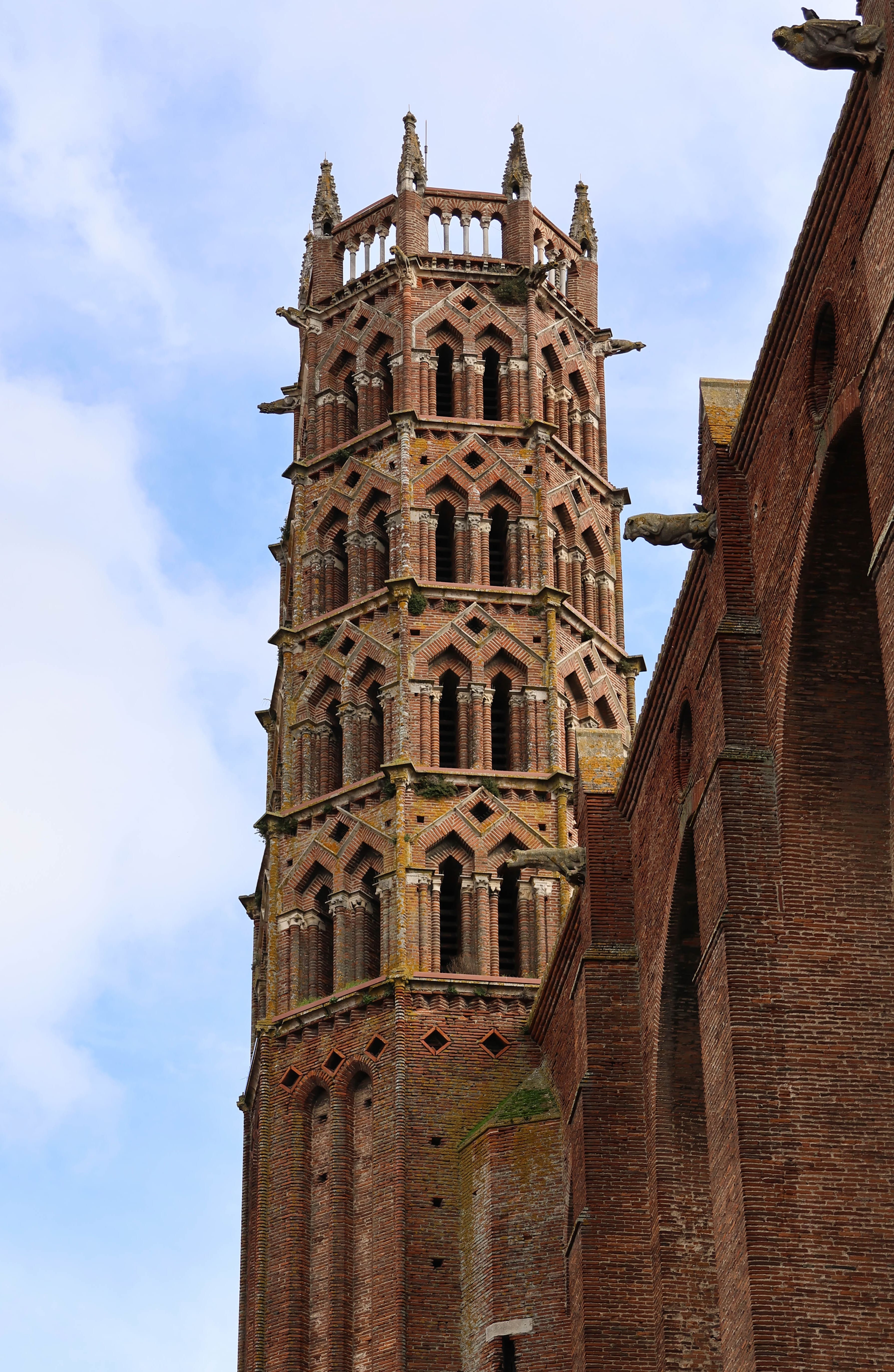 L’église inaugurée le 2 février 1292 est également doutée d’un clocher octogonal à cinq étages. Il supportait une flèche qui fut détruite en 1795. Le clocher est ressemblant et contemporain de celui de la Basilique de Saint Sernin, un autre chef d’œuvre toulousain.