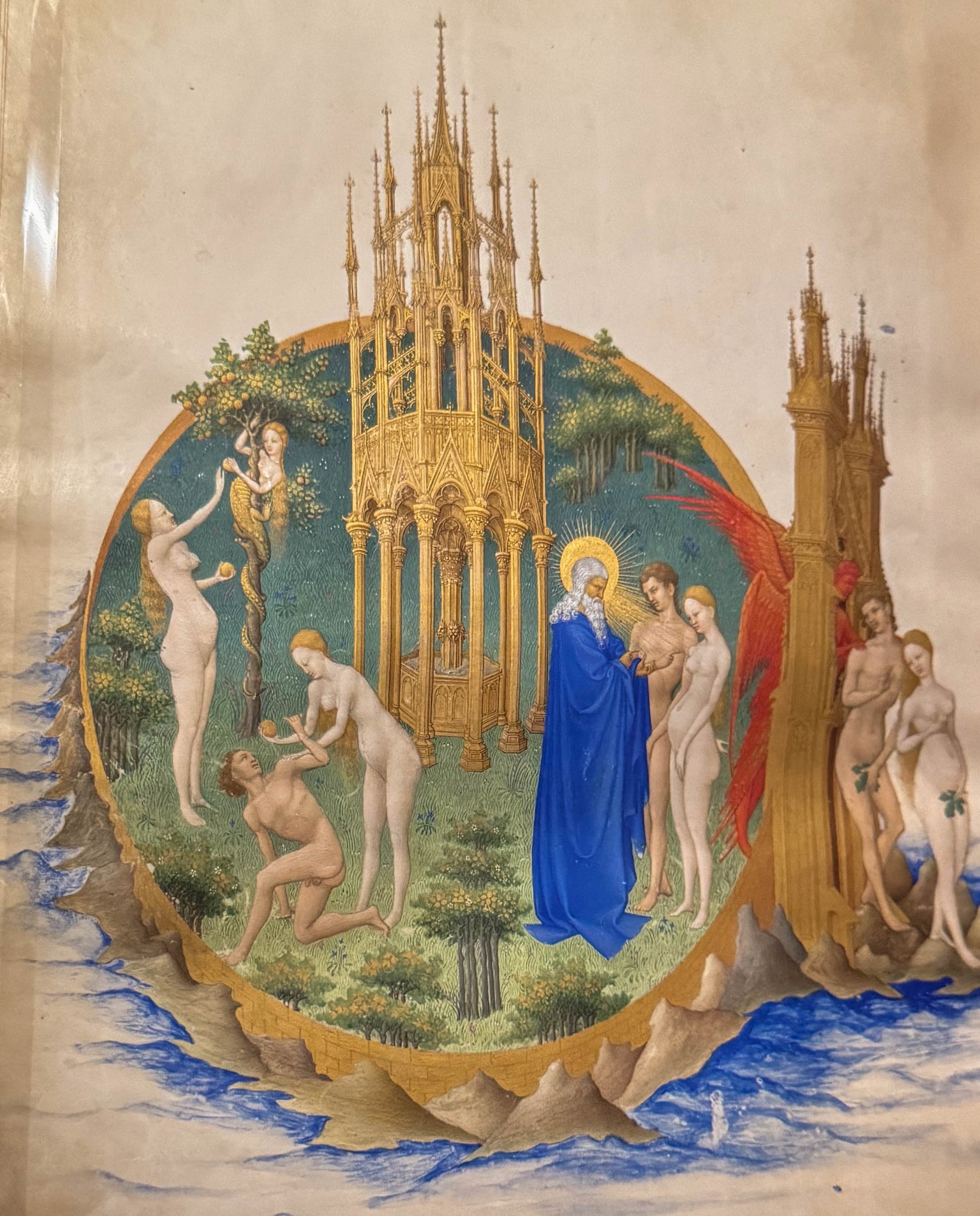 Le Duc de Berry commande un livre d’heures (livre de prières) aux frères Paul, Herman et Jean de Limbourg en 1411. Ce n’est pas un hasard si le Duc passe commande aux trois frères, ils sont considérés comme des prodiges du fait d’un sens important du réalisme, de l’usage d’une lumière « naturelle », de personnages aux expressions laissant passer des émotions et bien évidemment par la diversité et les détails des paysages représentés, comme dans l’illustration du Paradis. 1416 marque un tournant dans l’œuvre. En effet, le Duc et les frères de Limbourg décèdent, sans doute atteints de la peste.